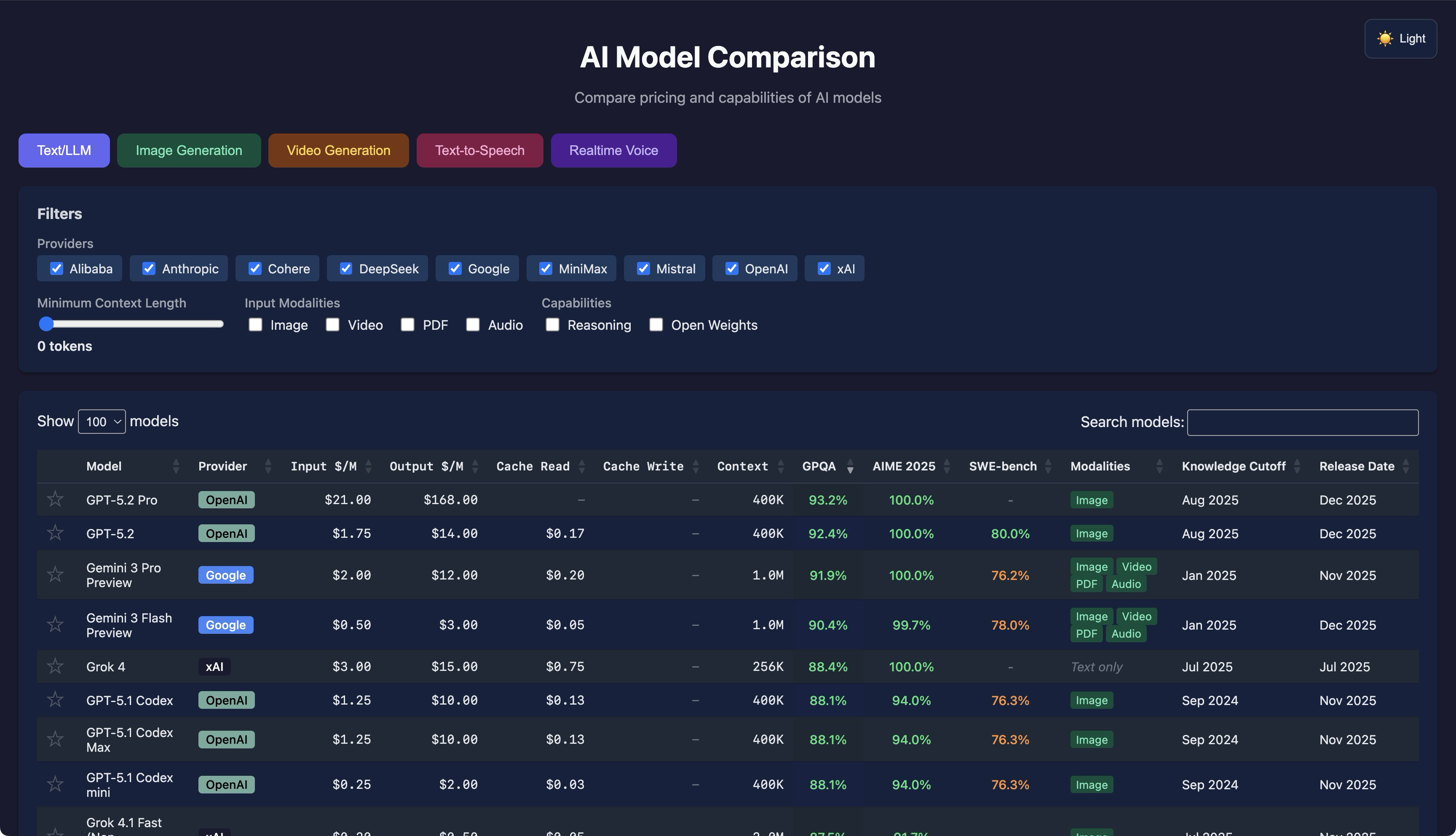 A single-page web app to compare AI models by pricing, capabilities, and benchmark performance.