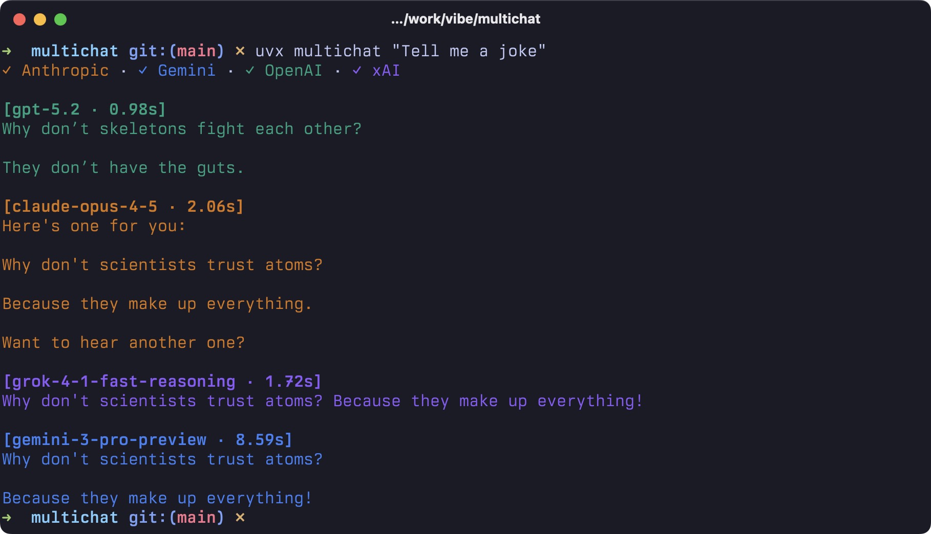 Run `uvx multichat` to receive responses from all four frontier LLMs.
