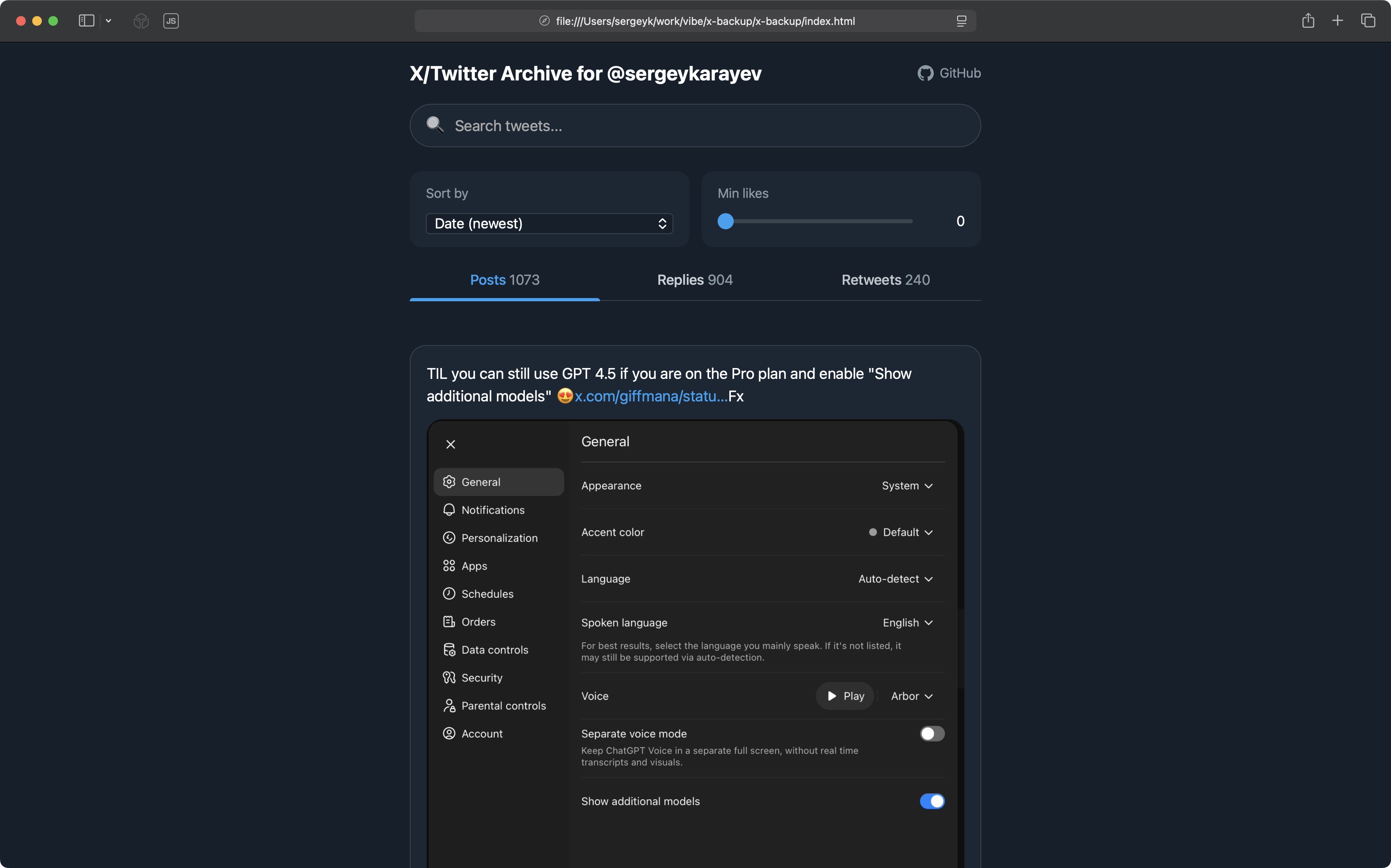 Run `npx x-backup ﹤path-to-twitter-data-export﹥` to create a beautiful, searchable, sortable single page backup of all of your X posts.